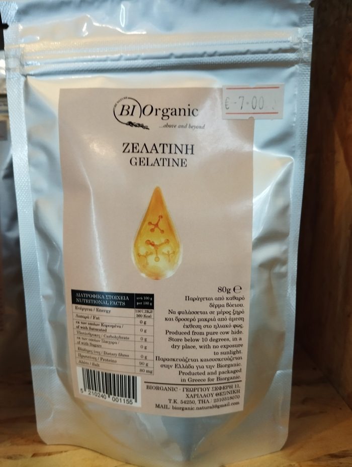 Original price was: €8.00.€7.00Η τρέχουσα τιμή είναι: €7.00. Στις τιμές συμπεριλαμβάνεται Φ.Π.ΑΖελατίνη από Μοσχάρι Ζελατίνη Βόειου (Beef) 80γρ
